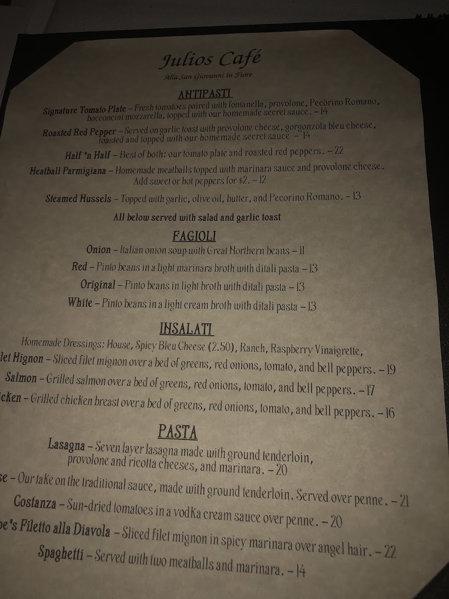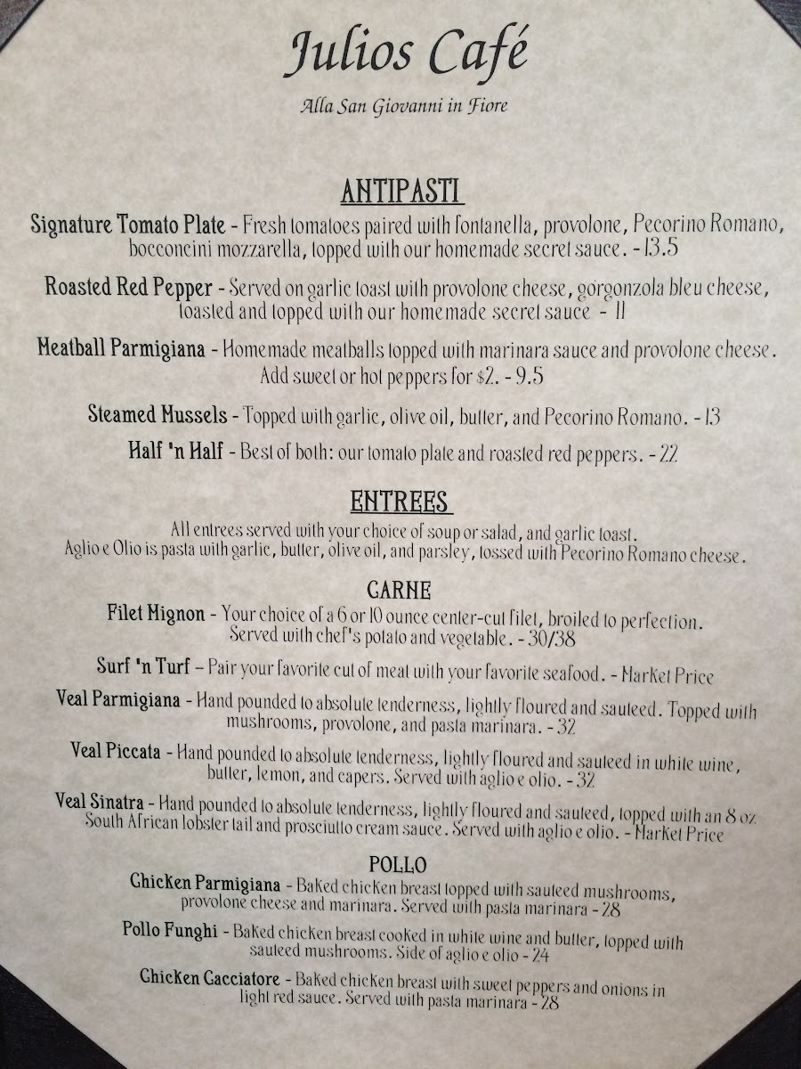 Julio's Café offers a menu that blends classic comfort with thoughtful, satisfying dishes, perfect for casual lunches, leisurely dinners, or relaxed weekend gatherings. The selection balances hearty, home-style favorites like lasagna and filet mignon with lighter, flavorful options such as their signature tomato plate and fresh salads.